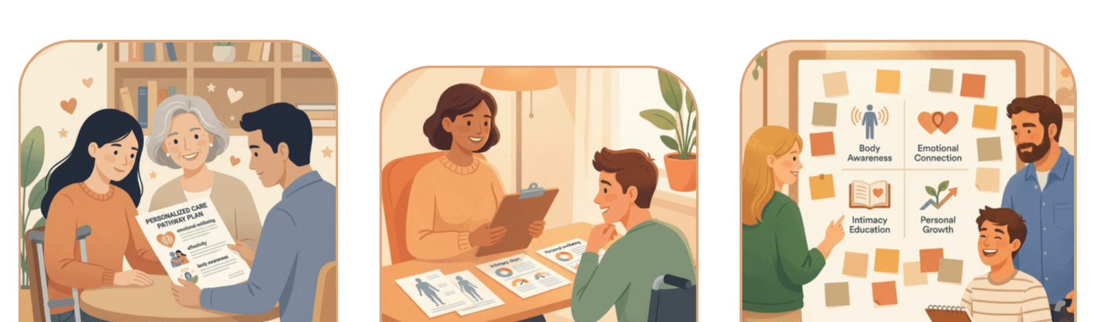 L'operatore accompagna la persona nel percorso verso la scoperta del corpo, dell'affettività e del piacere, rispettando i tempi di ciascuno.